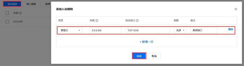 點(diǎn)擊【添加規(guī)則】,輸入來源、協(xié)議端口,選擇策略(允許),點(diǎn)擊【完成】按鈕,即可。完全按照下圖設(shè)置。