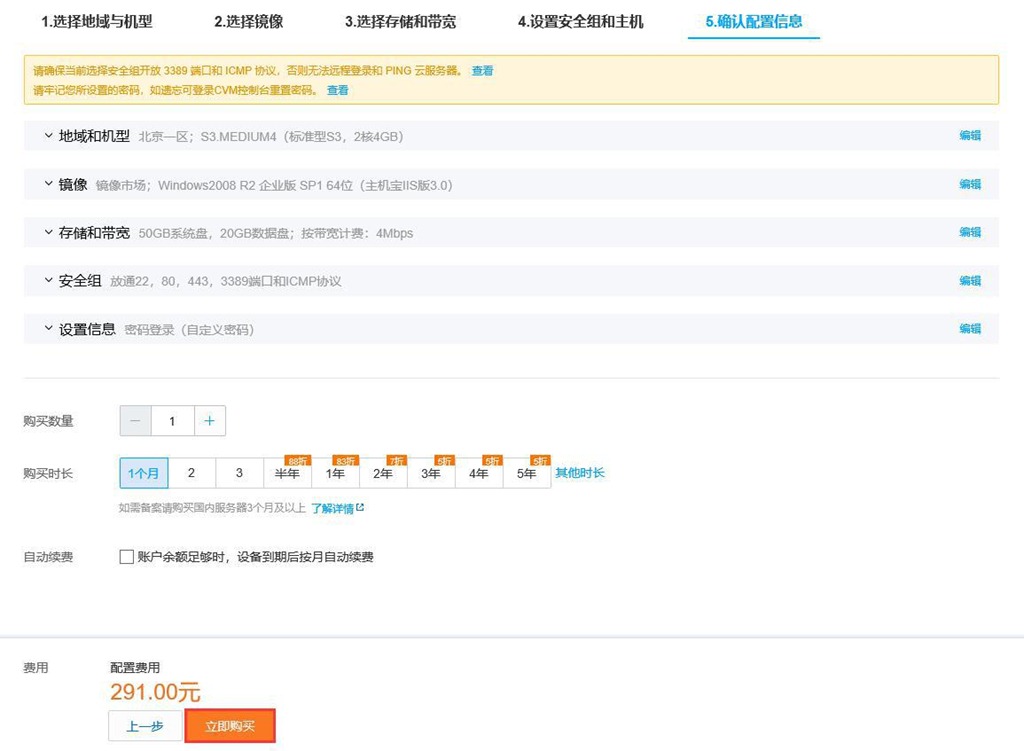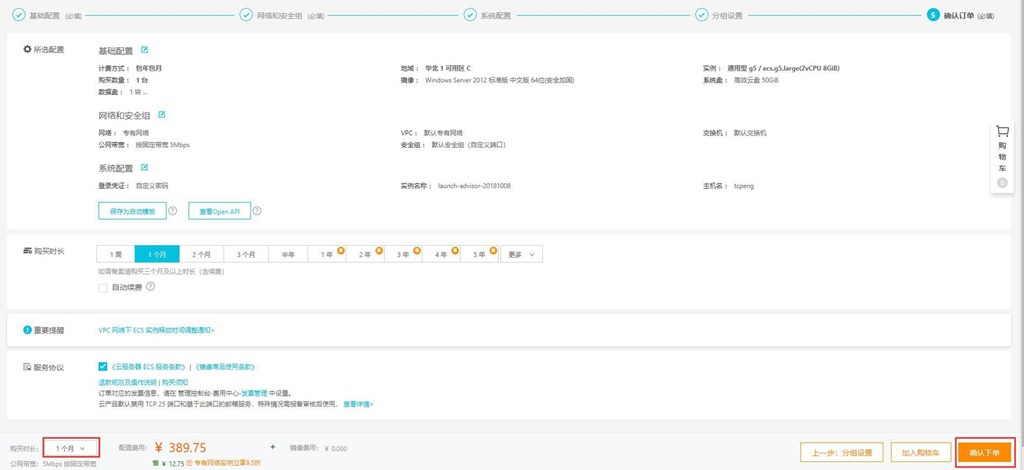 進(jìn)入[確認(rèn)配置信息]頁面,選擇購買數(shù)量、購買時(shí)長,點(diǎn)擊【立即購買】按鈕。
