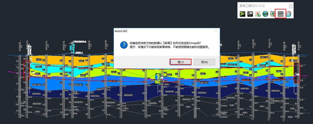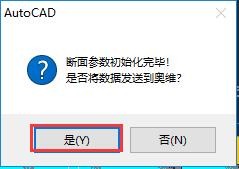 將基線發(fā)送到CAD中后,系統(tǒng)跳轉(zhuǎn)至CAD窗口,彈出提示“斷面初始化完畢,是否將數(shù)據(jù)發(fā)送到奧維”,點(diǎn)擊【是】按鈕,執(zhí)行發(fā)送。