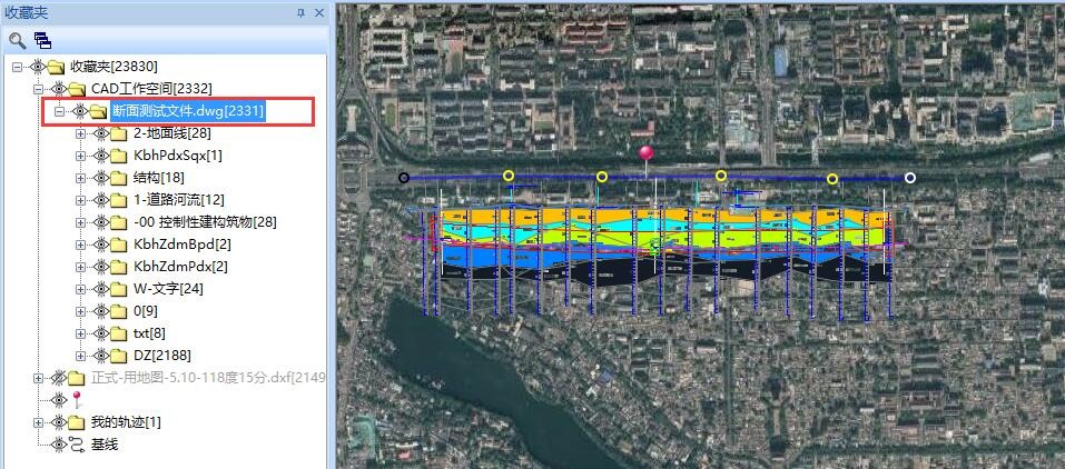 發(fā)送完成后,在奧維互動(dòng)地圖中,收藏夾會(huì)自動(dòng)創(chuàng)建一個(gè)以“CAD工作空間”命名的文件夾,地圖上會(huì)顯示發(fā)送過(guò)來(lái)的斷面圖。