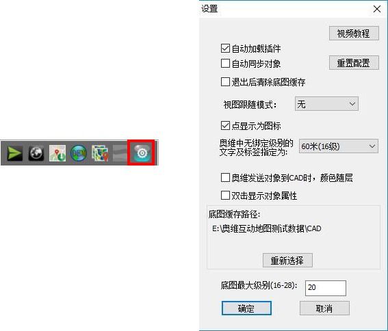 (9)底圖緩存路徑:用于存放CAD加載底圖時(shí)緩存的數(shù)據(jù)。插件已設(shè)置好默認(rèn)路徑,用戶可點(diǎn)擊【重新選擇】按鈕,重新選擇下載的底圖存儲(chǔ)目錄。