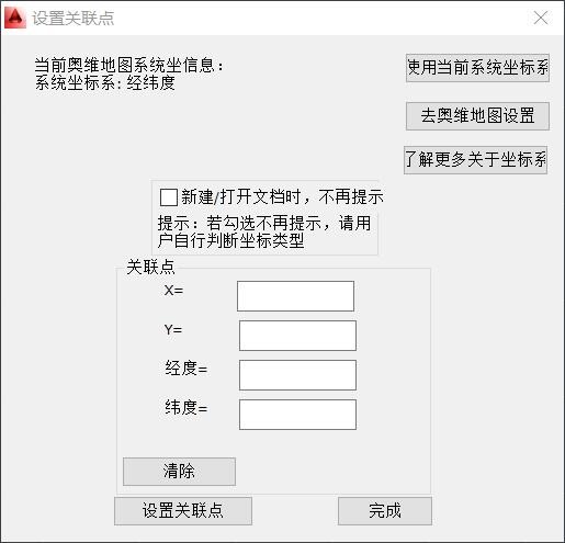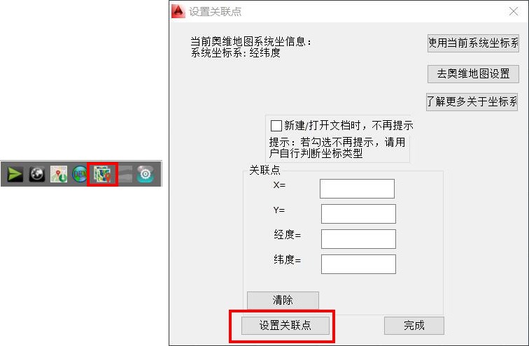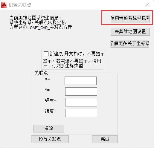 使用OmapCAD插件,首先要設(shè)置坐標(biāo)系。默認(rèn)情況下,每次啟動(dòng)AutoCAD,會(huì)自動(dòng)彈出[設(shè)置關(guān)聯(lián)點(diǎn)]窗口,提示您設(shè)置坐標(biāo)系。
