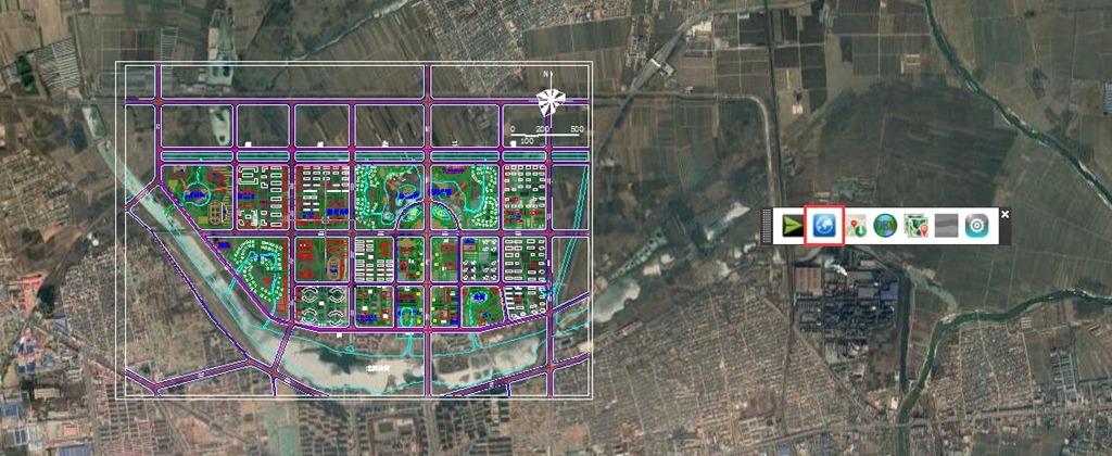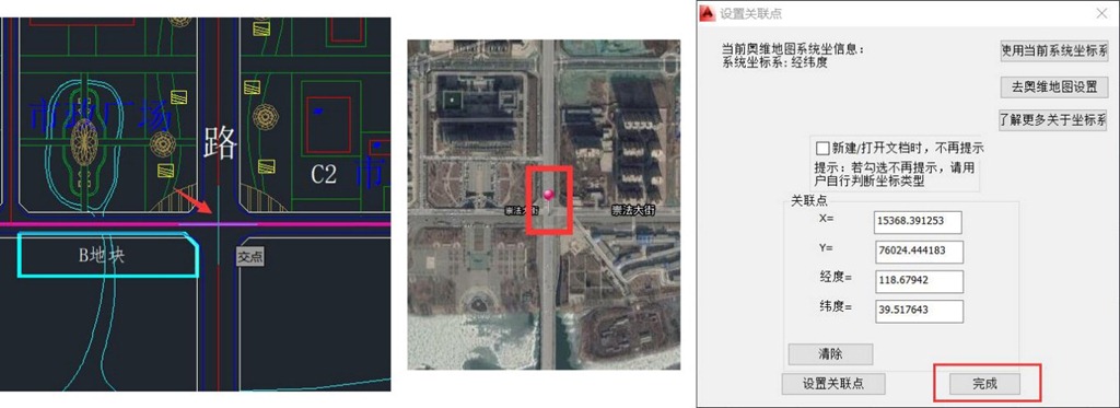 設(shè)置關(guān)聯(lián)點(diǎn):即建立CAD文件某點(diǎn)的平面坐標(biāo)與經(jīng)緯度坐標(biāo)的對(duì)應(yīng)關(guān)系。