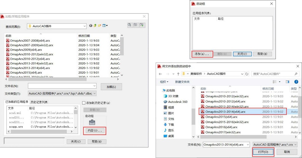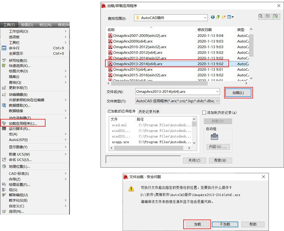 啟動(dòng)AutoCAD,安裝相應(yīng)版本的OmapCAD插件,操作如下。