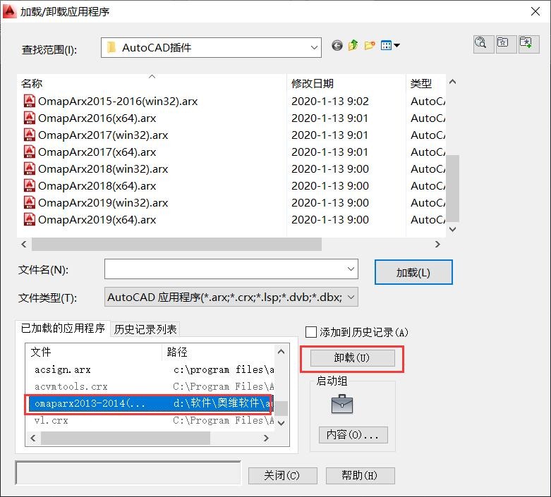 在[加載/卸載應(yīng)用程序]窗口,選中已加載的omaparx,點(diǎn)擊【卸載】,即可。