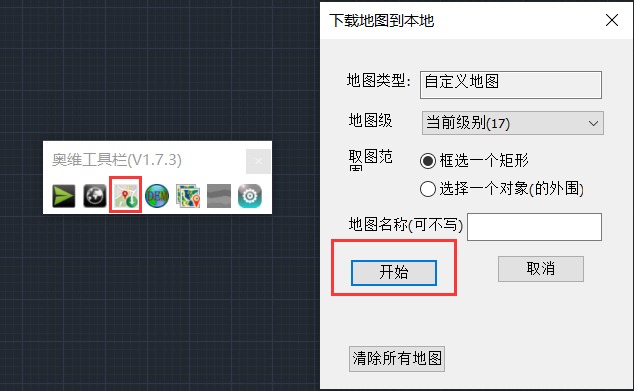 在OmapCAD插件的操作面板中,點(diǎn)擊wps60按鈕,彈出[下載地圖到本地]窗口,設(shè)置好需要下載的地圖級(jí)別、取圖范圍,地圖名稱,點(diǎn)擊【開(kāi)始】按鈕。