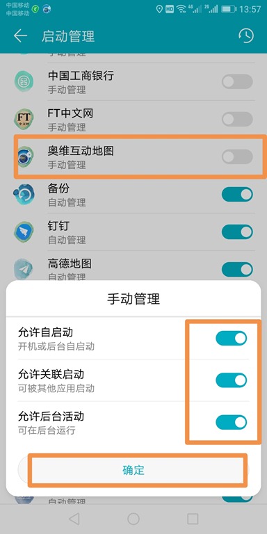 (1)若啟動管理里面顯示奧維互動地圖為“自動管理”,點擊關(guān)閉右側(cè)的藍色開關(guān),設(shè)置為手動管理,在彈出的面板中打開全部三個開關(guān)(允許自動啟動、允許關(guān)聯(lián)啟動、允許后臺活動),點擊【確定】按鈕。
