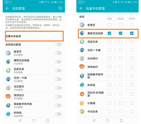 (2)若用戶的設(shè)置里面奧維互動地圖已為“手動管理”,請點擊【批量手動管理】,查看【自啟動】【關(guān)聯(lián)啟動】【后臺活動】是否全部勾選,若沒有,請全部勾選。