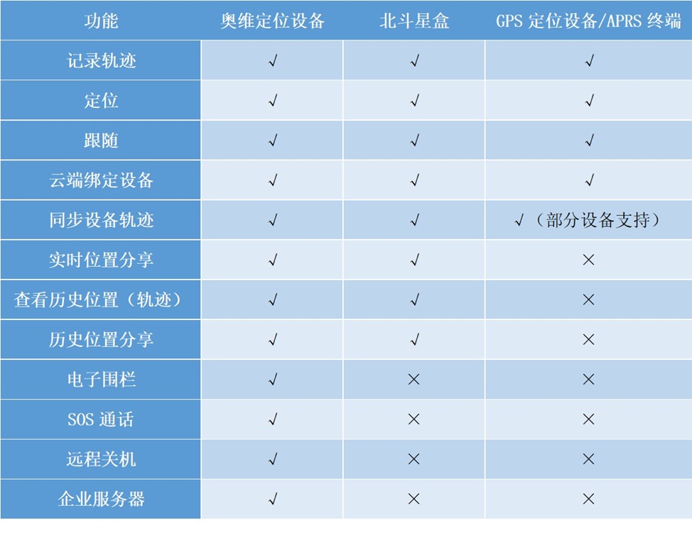 目前,奧維支持的各類(lèi)定位設(shè)備在通過(guò)奧維客戶(hù)端實(shí)現(xiàn)功能方面也存在較大差異,如下表所示。另外,奧維定位設(shè)備的功能還在不斷完善中,可根據(jù)用戶(hù)實(shí)際需求增加相關(guān)功能,下表所列功能均已實(shí)現(xiàn)。