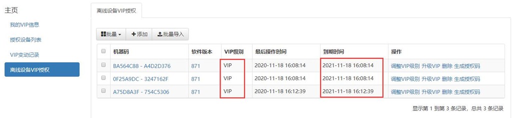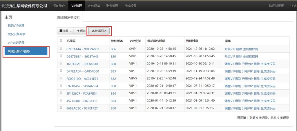 在系統(tǒng)中,點擊【VIP管理】→【離線設(shè)備VIP授權(quán)】→【批量導(dǎo)入】。