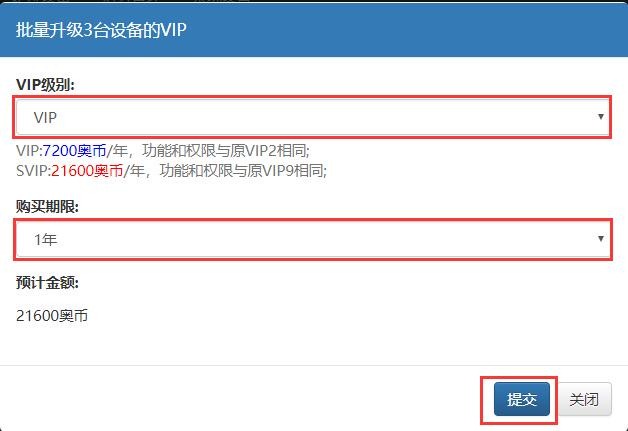 • 如給所有的設(shè)備升級到有效期限為1年的VIP,每臺設(shè)備需要7200奧維幣;如給所有的設(shè)備升級到有效期限為1年的SVIP,每臺設(shè)備需要21600奧幣;