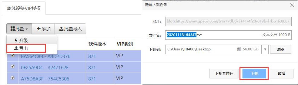升級完成后,勾選設(shè)備,點擊【批量】→【導(dǎo)出】,自動生成txt文件