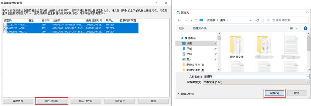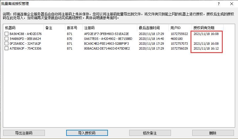 在[批量離線授權(quán)管理]窗口中,勾選需要授權(quán)的機器,點擊【導(dǎo)出注冊碼】,批量導(dǎo)出需要授權(quán)的機器。