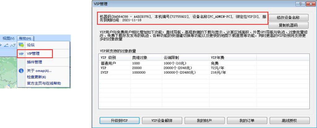 在離線電腦的奧維互動地圖中,您可以點擊【幫助】→【VIP管理】查看VIP等級和服務(wù)到期時間。