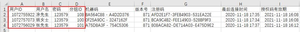 創(chuàng)建賬戶,只需要用戶ID、用戶名、密碼、分組ID這四個字段。其他的字段您可以刪除,也可以放在在表格的最后幾列。