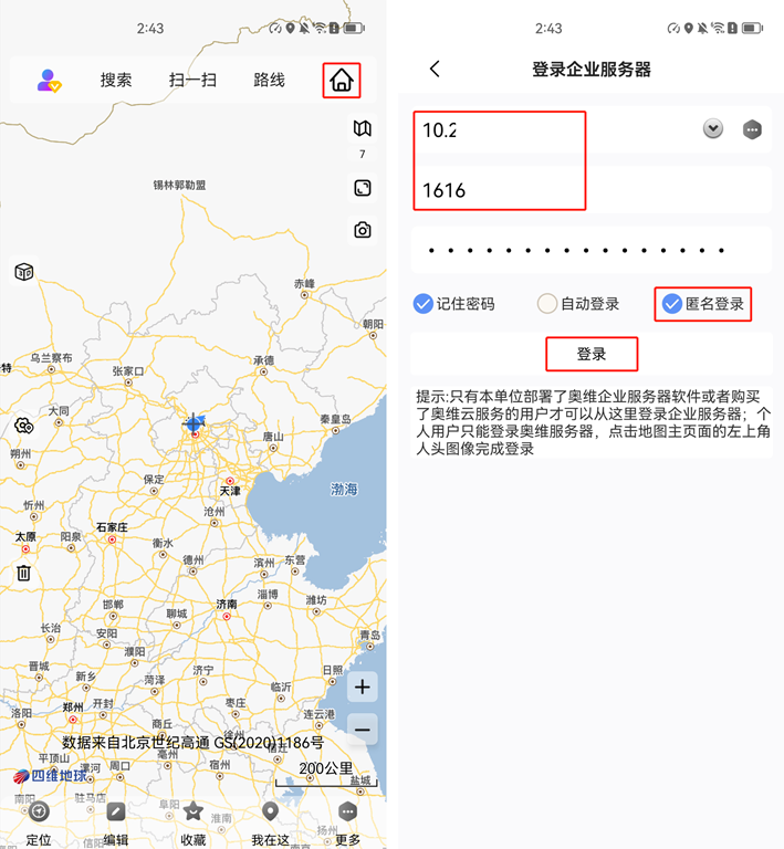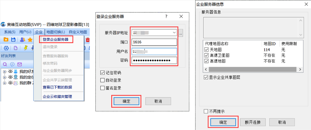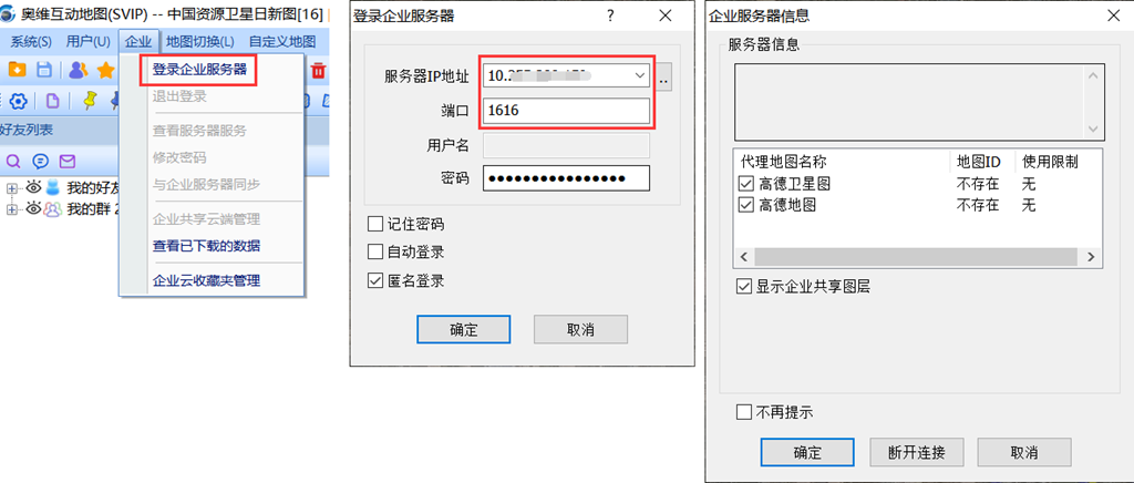 在電腦端的奧維互動地圖中,點擊[企業(yè)]→【登錄企業(yè)服務(wù)器】,輸入服務(wù)器ip地址、端口號、用戶名和密碼,點擊【登錄】,即可。