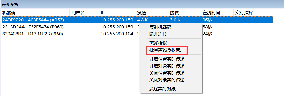 在管理控制臺【在線設(shè)備】窗口中,點擊鼠標(biāo)【右鍵】→【批量離線授權(quán)管理】。