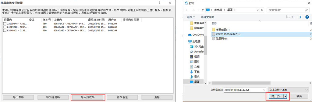在管理控制臺[在線設(shè)備]窗口,點擊鼠標(biāo)右鍵→【批量離線授權(quán)管理】→【導(dǎo)入授權(quán)碼】,選中授權(quán)文件,點擊【打開】按鈕。