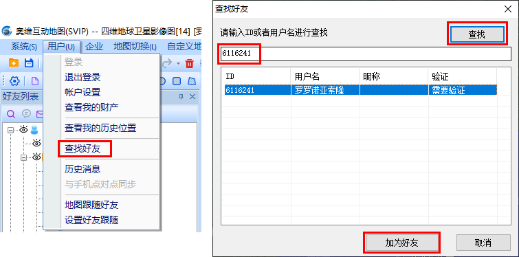 在奧維PC客戶端中,點(diǎn)擊[用戶]菜單,點(diǎn)擊【查找好友】按鈕,進(jìn)入[查找好友]窗口,輸入好友ID、用戶名或者手機(jī)號(hào),點(diǎn)擊【查找】按鈕,可查找出好友,點(diǎn)擊【加為好友】按鈕,可添加查找出的用戶為好友。