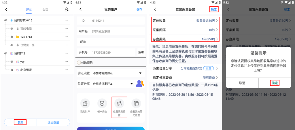 (3)存盤期限:用戶可根據(jù)實(shí)際需要設(shè)置,不同期限需要不同等級(jí)的VIP;若用戶設(shè)置為【無】,則收集的軌跡和實(shí)時(shí)位置不會(huì)存盤。