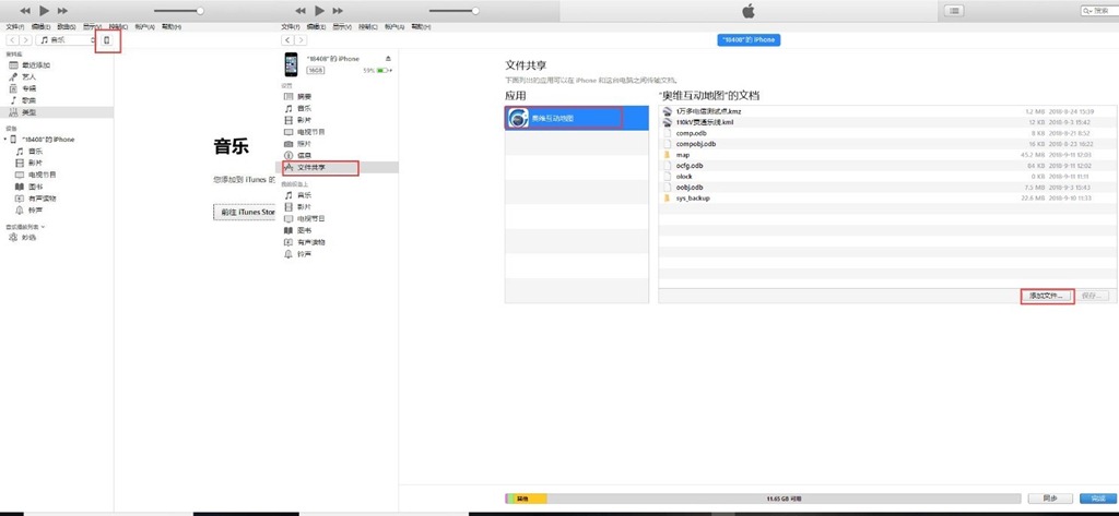 蘋果用則需要通過iTunes將數(shù)據(jù)放到奧維根目錄下,如下圖所示。連接手機(jī)后,點(diǎn)擊【共享文件】,找到奧維互動(dòng)地圖,點(diǎn)擊【添加文件】,將文件添加到奧維互動(dòng)地圖的目錄下即可。