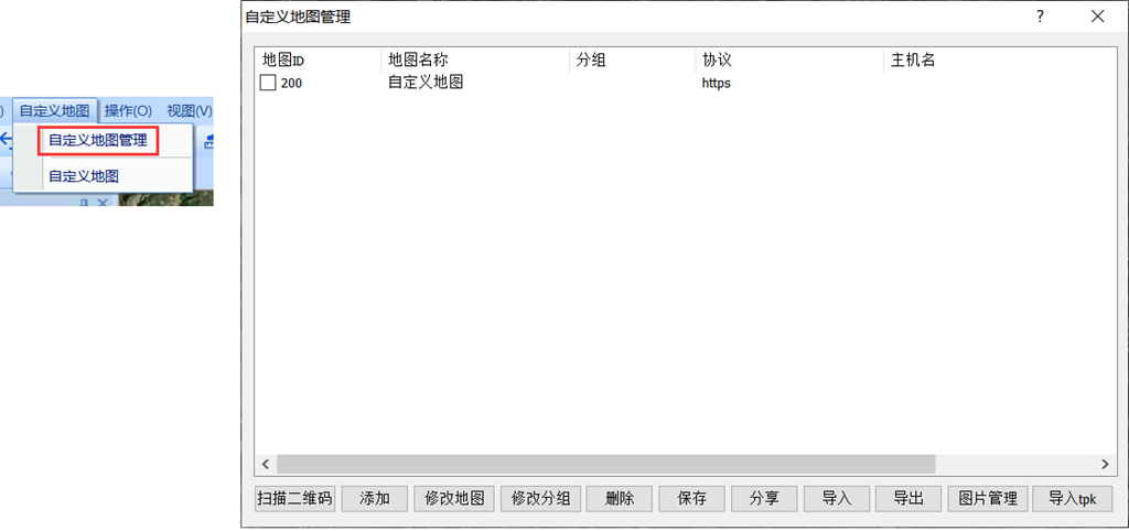 在奧維PC端中,點(diǎn)擊[自定義地圖]菜單,點(diǎn)擊【自定義地圖管理】,進(jìn)入[自定義地圖管理]窗口。
