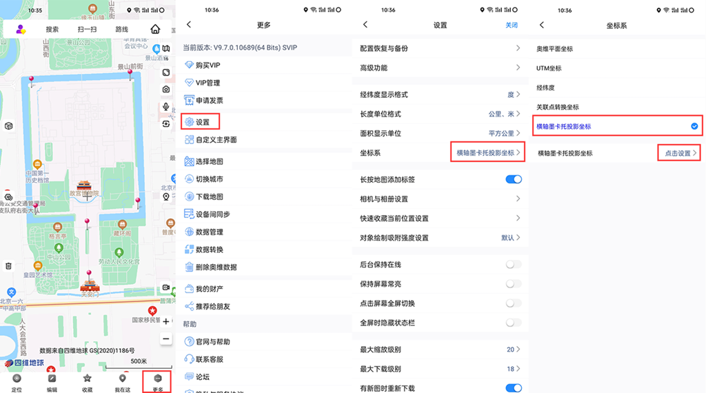 在手機端主界面,點擊【更多】,點擊【設(shè)置】,點擊【坐標(biāo)系】,選擇【橫軸墨卡托投影坐標(biāo)】,點擊設(shè)置,進(jìn)入[橫軸墨卡托投影坐標(biāo)]頁面。