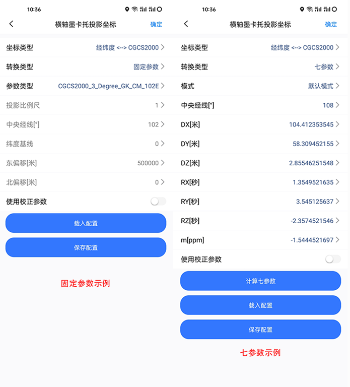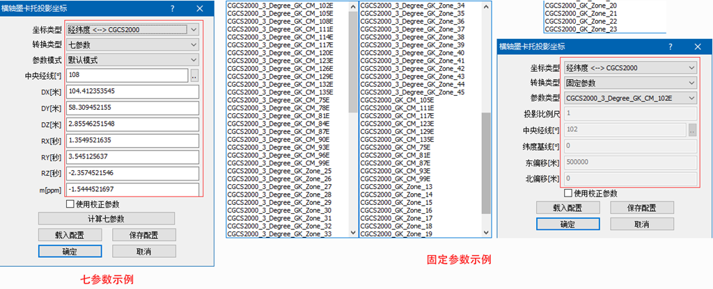 關(guān)于參數(shù)的說明請參考本文《1.2.1設(shè)置系統(tǒng)坐標(biāo)系》,這里不以贅述。七參數(shù)和固定參數(shù)的設(shè)置示例如下圖所示。