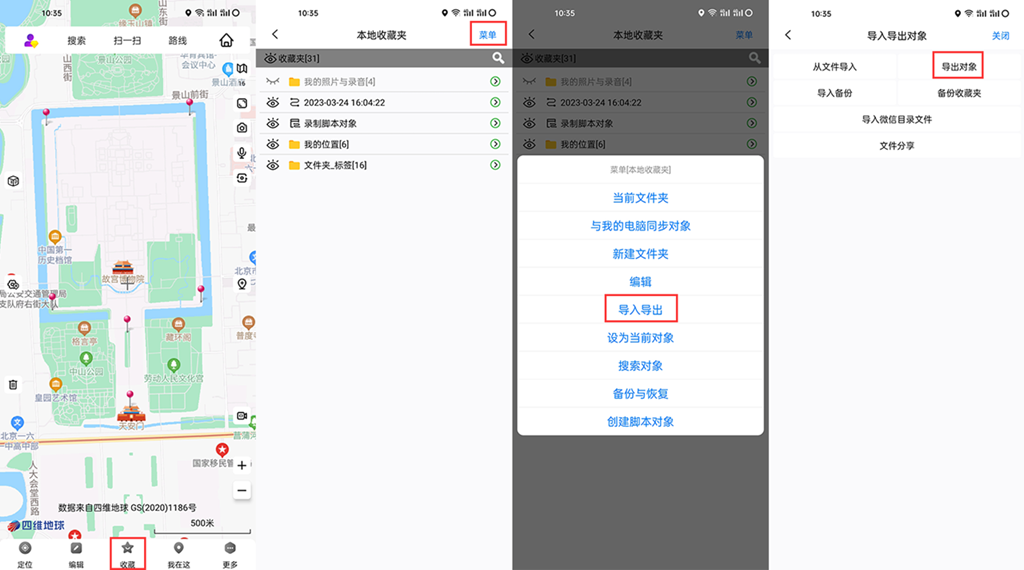 在手機端主界面,點擊【收藏】,點擊【菜單】,點擊【導(dǎo)入導(dǎo)出】,點擊【導(dǎo)出對象】,進(jìn)入[選擇對象]頁面。