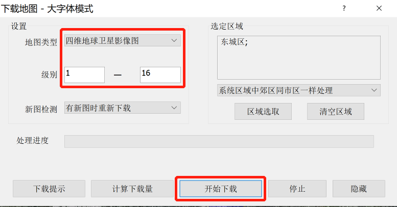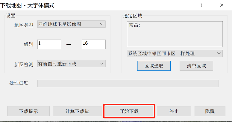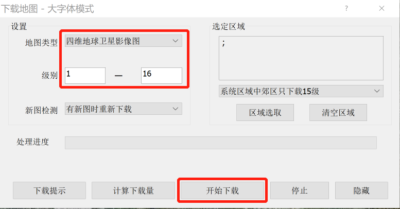 進入[下載地圖]對話框,設(shè)置地圖類型、級別等,點擊【開始下載】,即可。