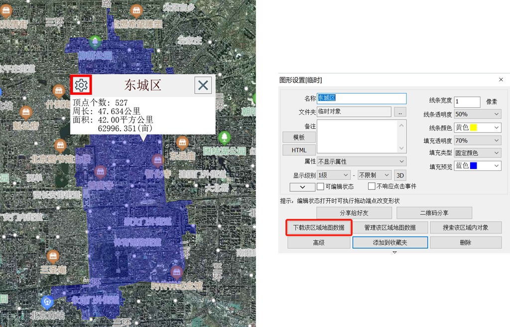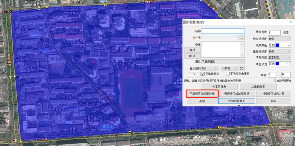 繪制到最后一個節(jié)點時雙擊鼠標左鍵,彈出[圖形設(shè)置]對話框,點擊【下載該區(qū)域地圖數(shù)據(jù)】。
