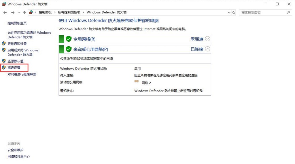 打開(kāi)控制面板,進(jìn)入到Windows 防火墻頁(yè)面,點(diǎn)擊【高級(jí)設(shè)置】。