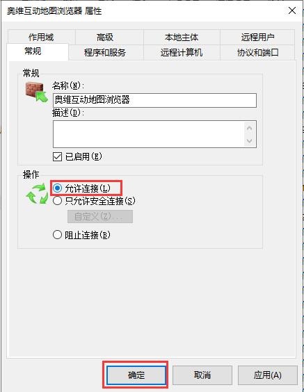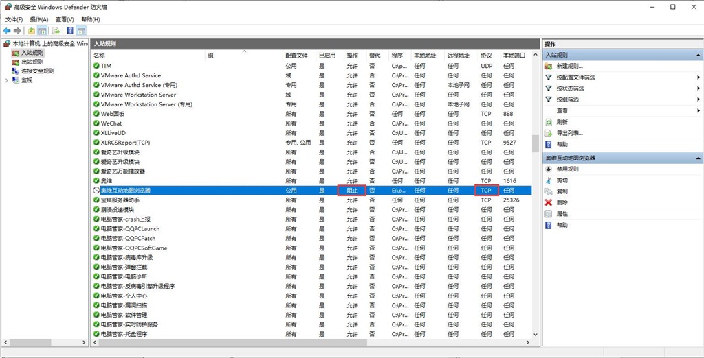點(diǎn)擊【入站規(guī)則】,找到奧維互動(dòng)地圖瀏覽“TCP協(xié)議”的條目,如下圖,現(xiàn)在是“阻止”的狀態(tài)。選中并雙擊,將屬性設(shè)置為允許連接,點(diǎn)擊【確定】,即可。如果奧維有多個(gè)條目,都設(shè)置為”允許連接“。
