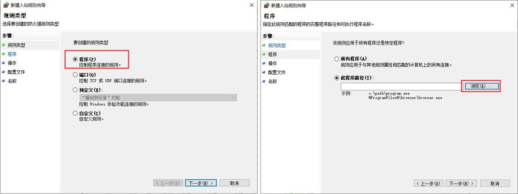 選擇【程序】,點(diǎn)擊【下一步】;選擇【此程序路徑】,點(diǎn)擊【瀏覽】。