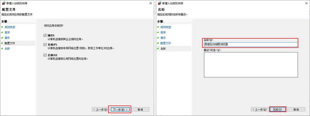 勾選【域】【專用】和【公用】,點(diǎn)擊【下一步】;設(shè)置名稱,點(diǎn)擊【完成】,即可。