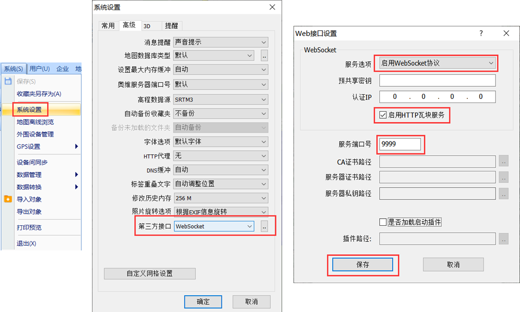 在奧維PC版中,點(diǎn)擊【系統(tǒng)】菜單-->【系統(tǒng)設(shè)置】-->【高級(jí)】-->【第三方接口】,選擇【W(wǎng)ebSocket】,點(diǎn)擊【…】,進(jìn)入【W(wǎng)eb接口設(shè)置】窗口。