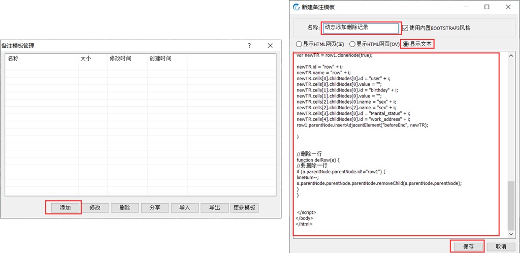 在[備注模板管理]頁面,點擊【添加】按鈕,輸入名稱,點擊【顯示文本】,將代碼復制到此處,點擊【保存】,即可。