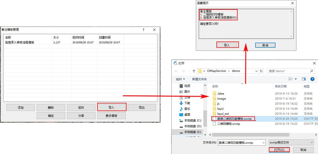 在[備注模板管理]頁面,點擊【導入】,選擇模板文件(.ovctp文件),點擊【打開】,點擊【導入】,即可。該文件中含有二維碼功能需要用到的兩個模板,如下圖所示。