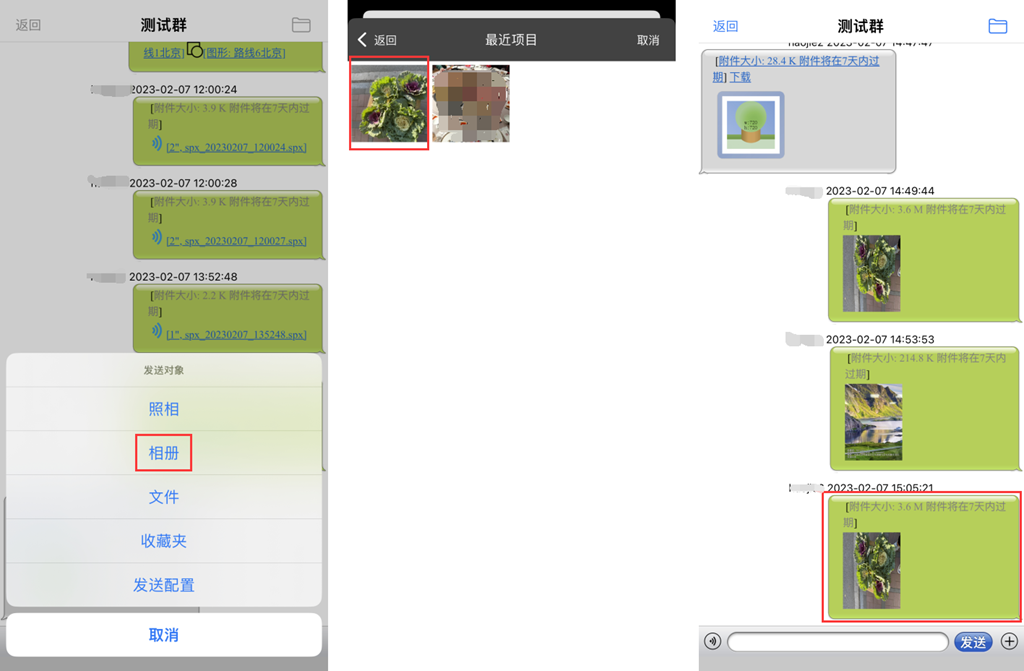 群成員可將手機相冊中照片發(fā)送到群中,也可直接拍攝照片發(fā)送。