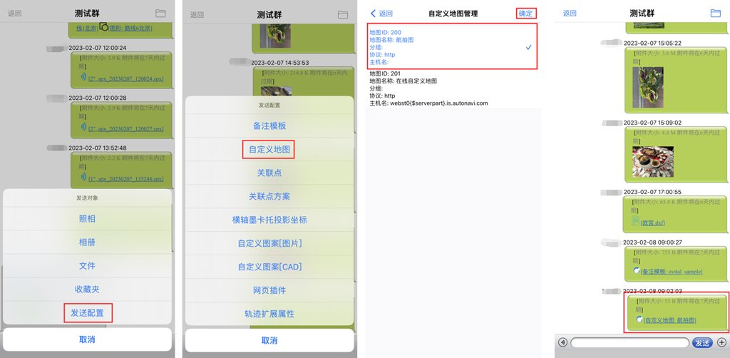 除了可以在群中發(fā)送奧維的標(biāo)簽、軌跡、圖形、導(dǎo)航路線等數(shù)據(jù)外,還可以發(fā)送手機拍攝的照片以及存儲的文件。