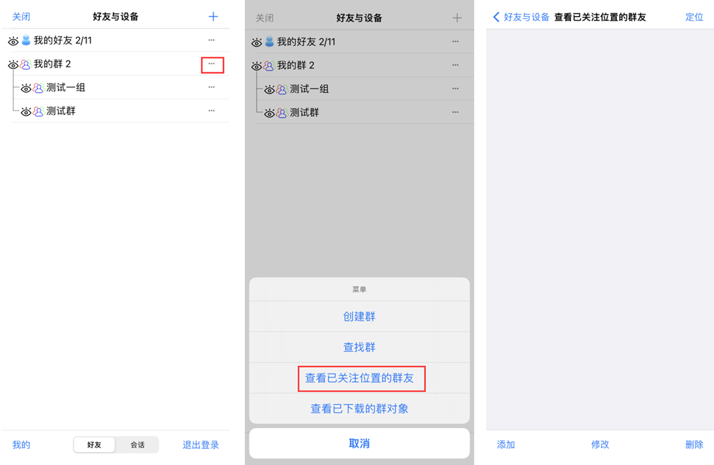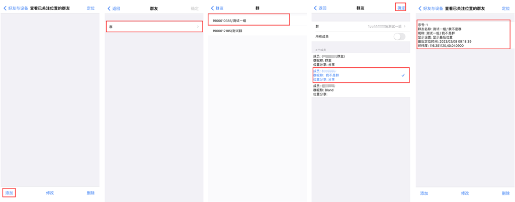 在[查看已關(guān)注位置的群友]頁面,點擊【添加】,點擊【群】,選擇群,勾選已分享位置的群友A(也可以直接添加所有成員),點擊【確定】,即可。