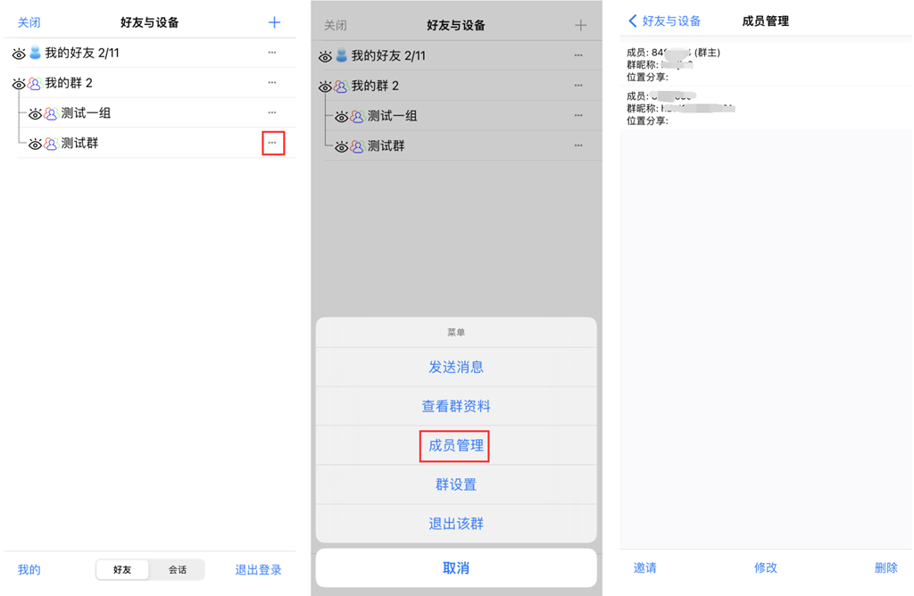 在[我的群]列表下,點擊某群右側(cè)的1按鈕,彈出[菜單]頁面;點擊【成員管理】,進入[成員管理]頁面,群主可邀請好友加入該群,可修改好友的群昵稱。