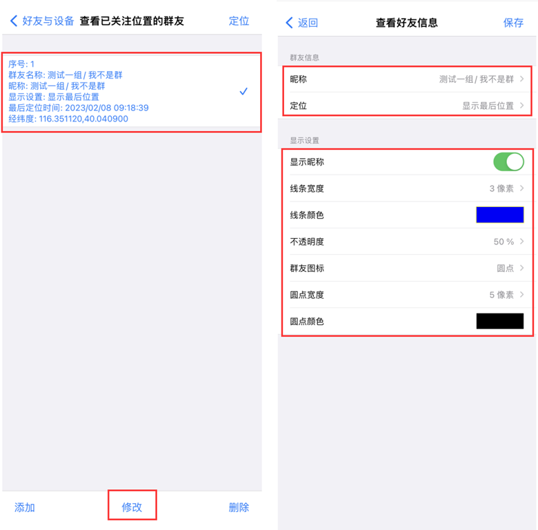 定位:可設(shè)置為顯示最后位置或者顯示軌跡。若設(shè)置為顯示軌跡的話,可將群友A的實時軌跡顯示在地圖上,且在【顯示設(shè)置】欄目中可對線條的顏色、寬度等進行設(shè)置。