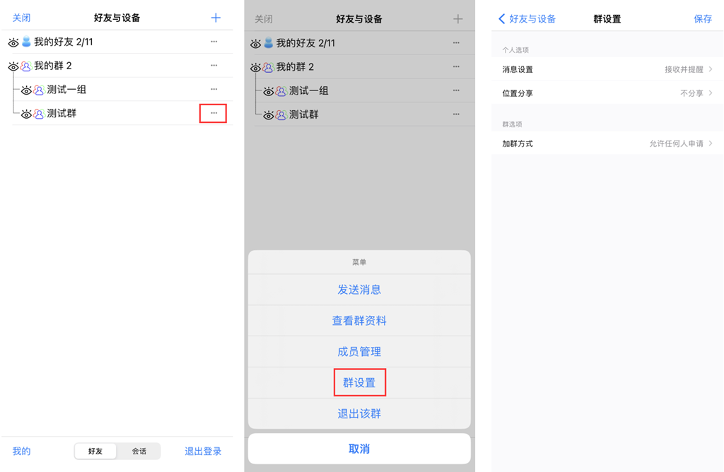 在[我的群]列表下,點擊某群右側(cè)的1按鈕,彈出[菜單]頁面;點擊【群設(shè)置】,進入[群設(shè)置]頁面,群主可對群選項的消息設(shè)置、位置分享以及群選項的加群方式進行設(shè)置,群成員可對個人選項的消息設(shè)置、位置分享進行設(shè)置。