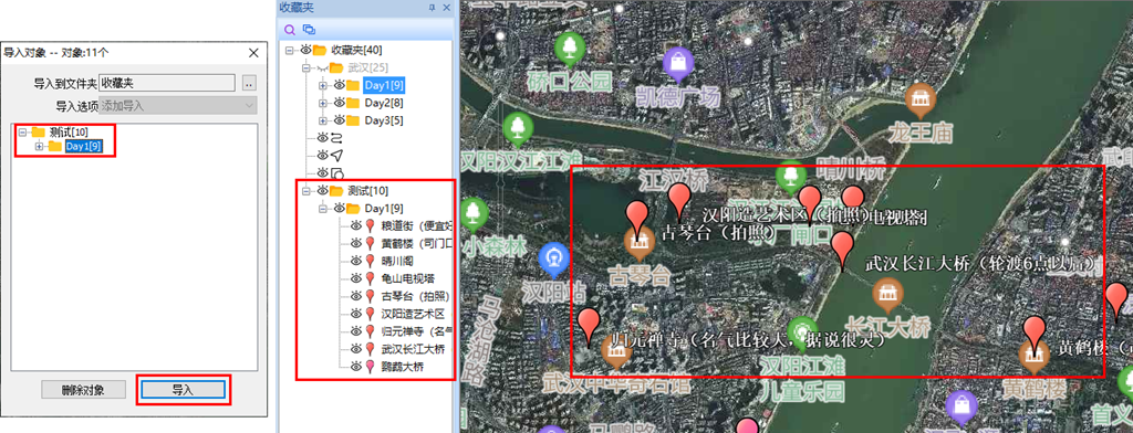 點(diǎn)擊【導(dǎo)入】按鈕,執(zhí)行導(dǎo)入文件。完成后,導(dǎo)入的坐標(biāo)點(diǎn)會自動生成奧維標(biāo)簽對象,保存在收藏夾中,顯示在地圖上。