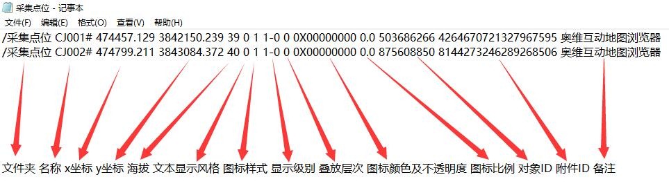 要將TXT文本中的坐標(biāo)數(shù)據(jù)導(dǎo)入到奧維中來,其字段排列順序必須按照奧維規(guī)定的格式進(jìn)行設(shè)置。奧維TXT格式數(shù)據(jù)模板如下: