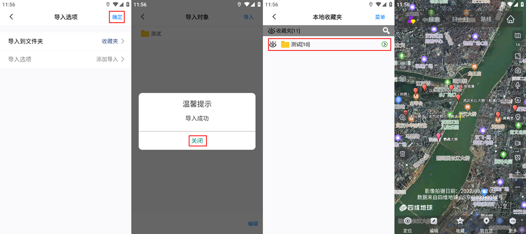 進(jìn)入[導(dǎo)入選項(xiàng)]頁面,點(diǎn)擊【確定】,執(zhí)行導(dǎo)入。導(dǎo)入完成后,數(shù)據(jù)會保存在收藏夾中,顯示在地圖上。
