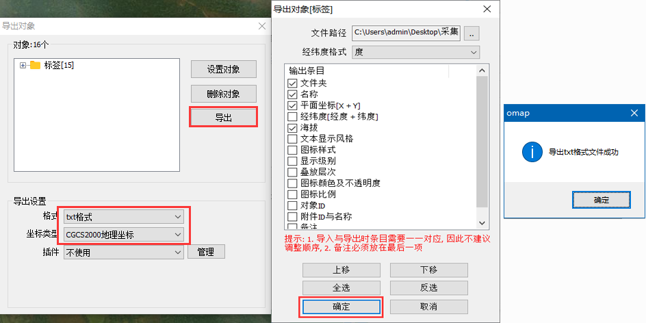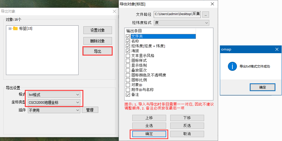 輸出條目:用戶可根據(jù)實(shí)際需要選擇需要輸出的屬性條目,本教程以導(dǎo)出文件夾、名稱、平面坐標(biāo)、海拔、備注為例。