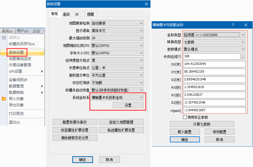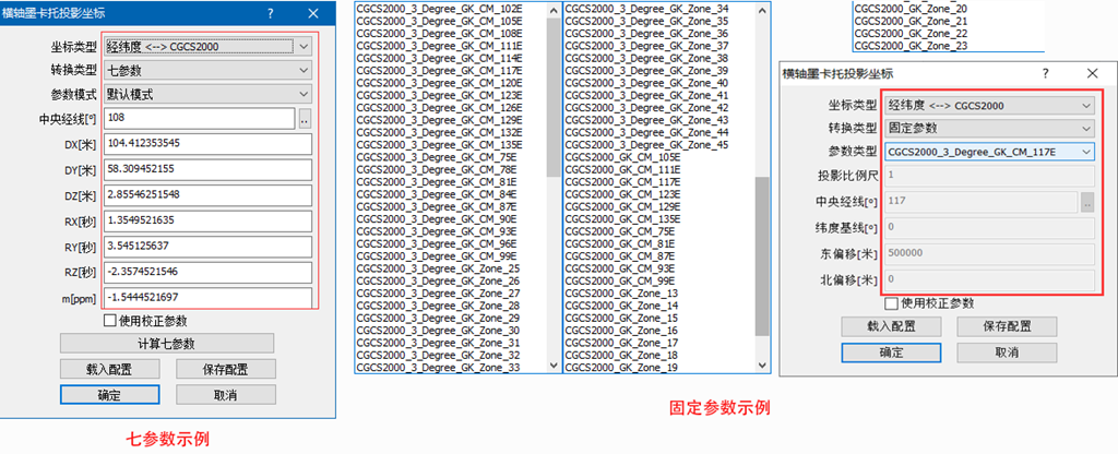 關(guān)于參數(shù)的說(shuō)明請(qǐng)參考本文《1.2.1設(shè)置系統(tǒng)坐標(biāo)系》,這里不以贅述。七參數(shù)和固定參數(shù)的設(shè)置示例如下圖所示。