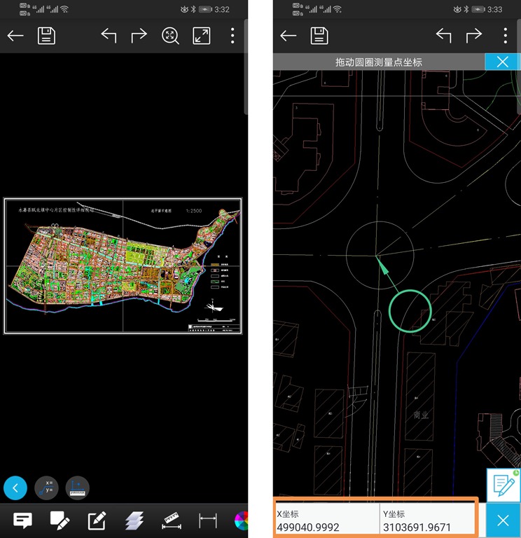 在手機(jī)上,使用CAD工具打開CAD文件,在圖紙中找到三個特征明顯的點,如交叉路口,地物拐角,這樣便于用戶在地圖上準(zhǔn)確的找到具體位置。